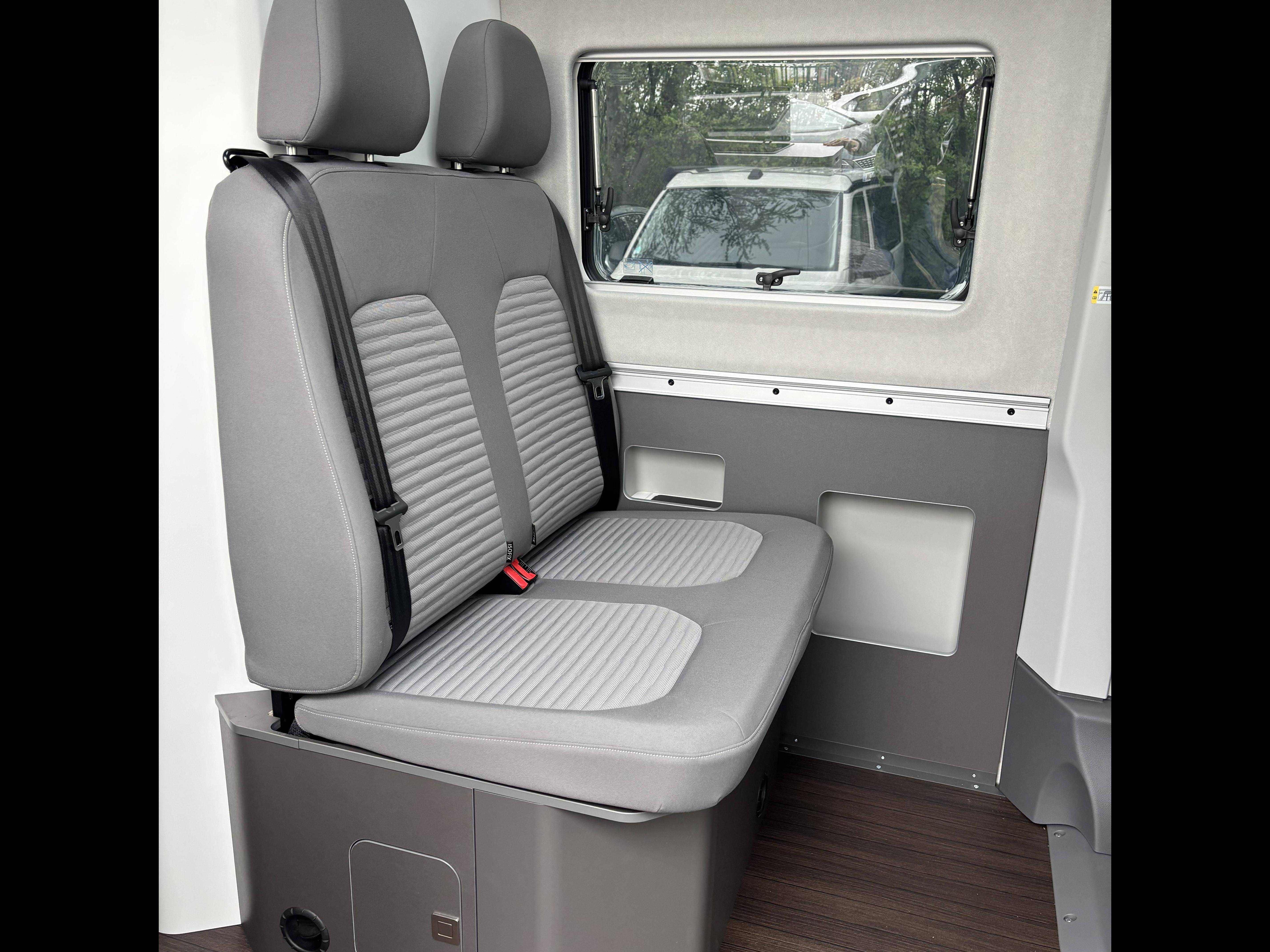 - Banquette 2 places dans l'espace de vie avec ceintures 3 points et ancrages de siège enfants Isofix et Top Tether